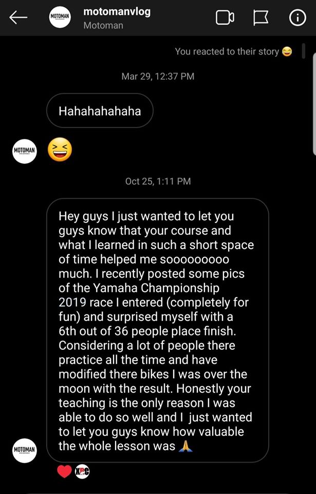 Hey guys I just wanted to let you guys know that your course and what I learned in such a short space of time helps me sooooooooo much. I recently posted some pics of the Yamaha Championship 2019 race I entered (completely for fun) and surprised myself with a 6th out of 36 people place finish. Considering a lot of people there practice all the time and have modified their bikes, I was over the moon with the result. Honestly, your teaching is the only reason I was able to do so well, and I just wanted to let you guys know how valuable the whole lesson was 🙏