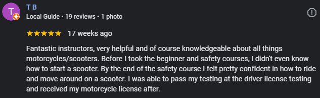 “Fantastic instructors, very helpful and of course knowledgeable about all things motorcycles/scooters. Before I took the beginner and safety course, I didn’t even know how to start a scooter. By the end of the safety course I felt pretty confident in how to ride and move around on a scooter. I was able to pass my testing at the driver license testing and received my motorcycle license after.”